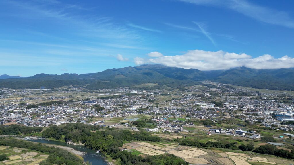 市の中心部を流れる千曲川を境に、北側には上信越高原国立公園の浅間連山、南側には台地が広がり、